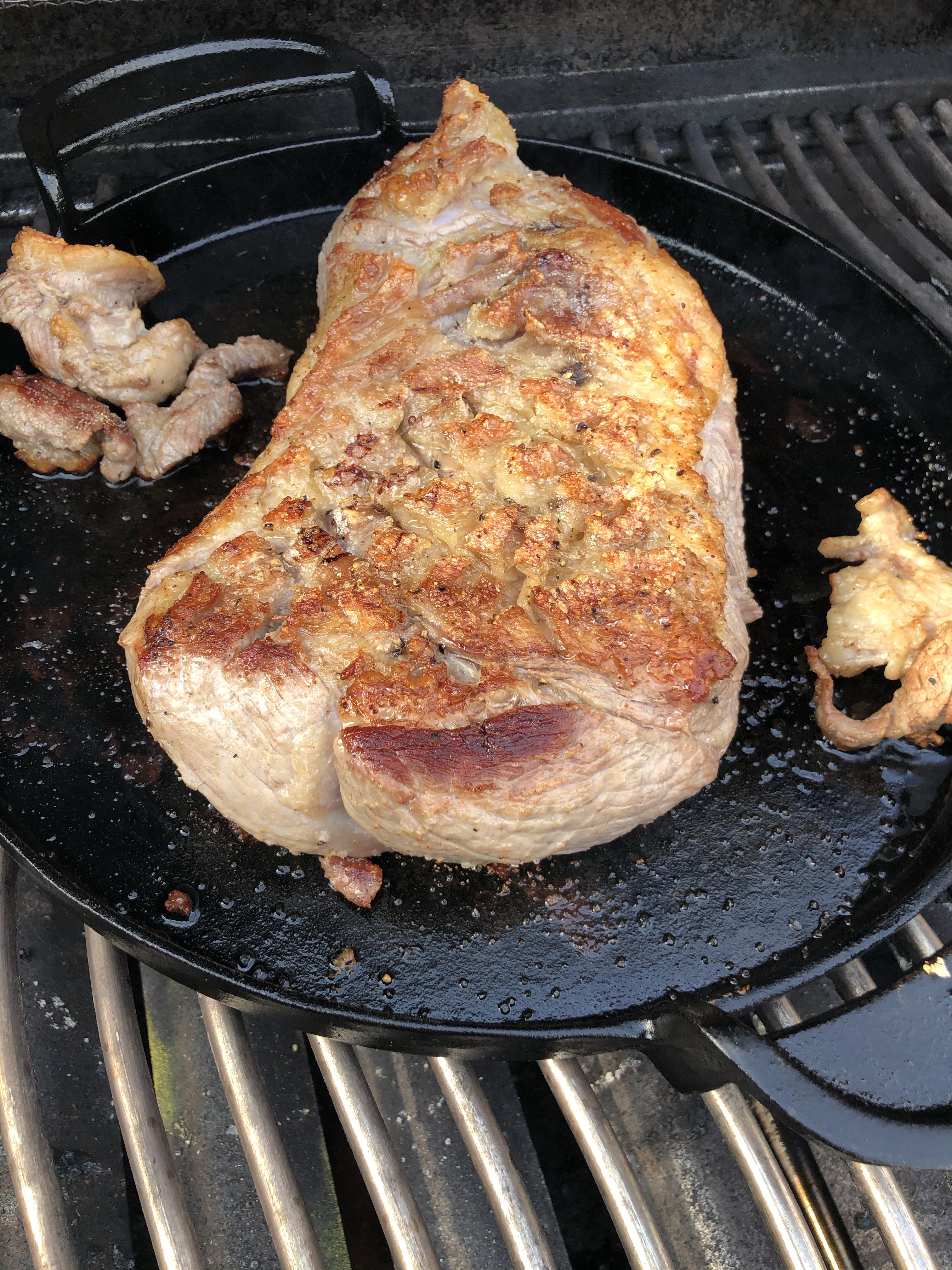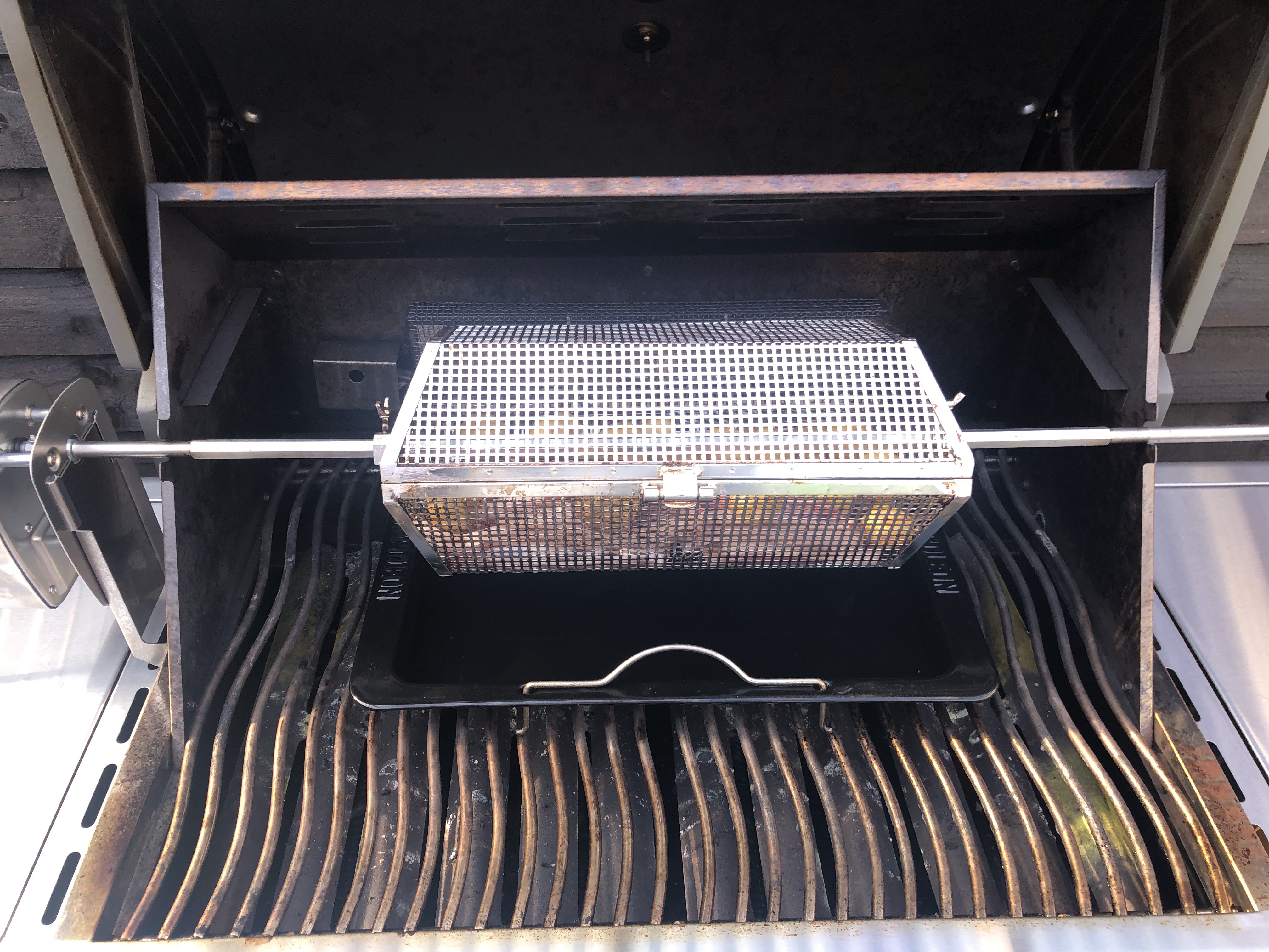 50-55 minutter på gasgrill i rotisseri, ledsaget af nye kartofler.