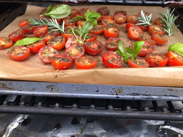 - Tomaterne lægges ud på en bageplade med bagepapir, med skærefladen opad.