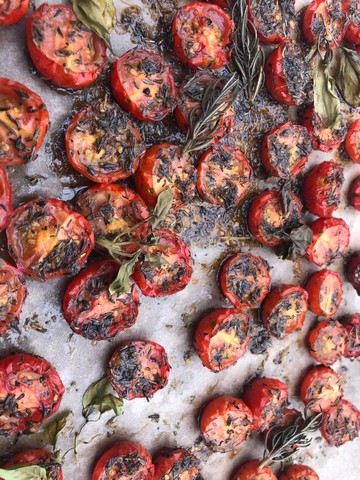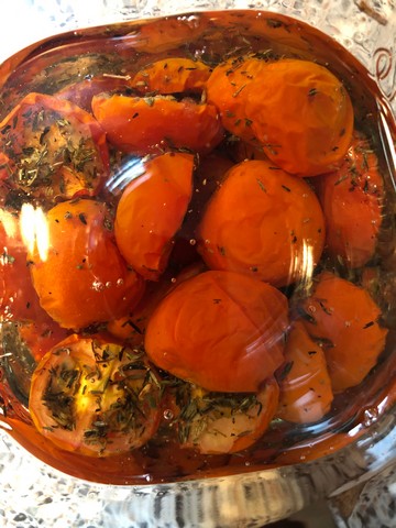 - Når tomaterne er færdige køles de ned. Spises herefter med det samme, eller lægges på glas og dækkes med olivenolie.
